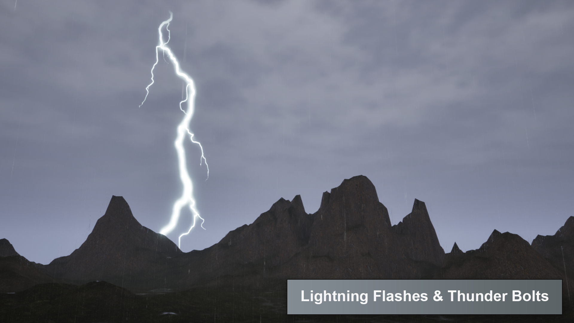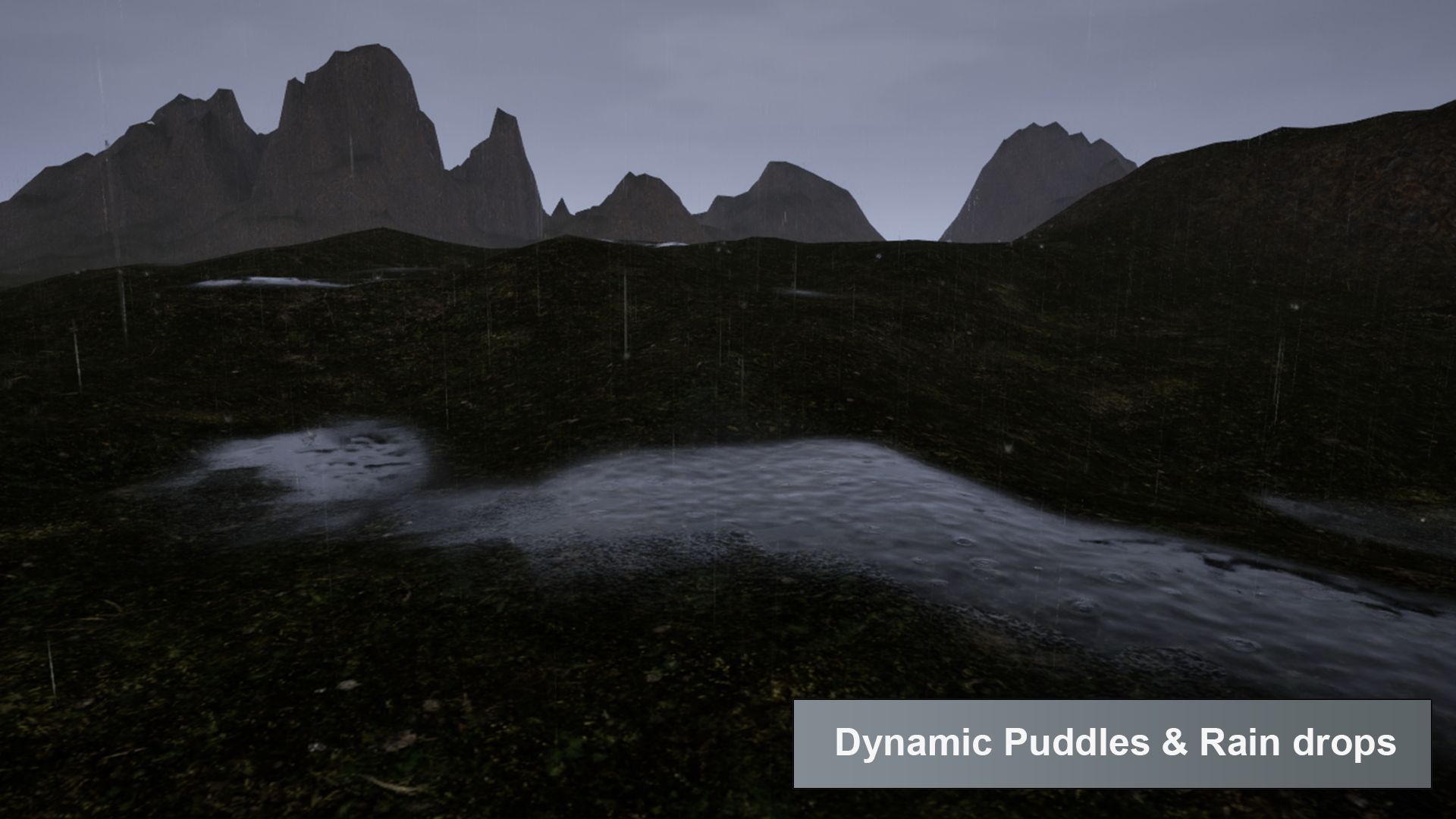 - Advanced Rain Effects: Features realistic raindrops, puddle formation, ripples, splashes, lightning flashes, and bolts to create dramatic effects.